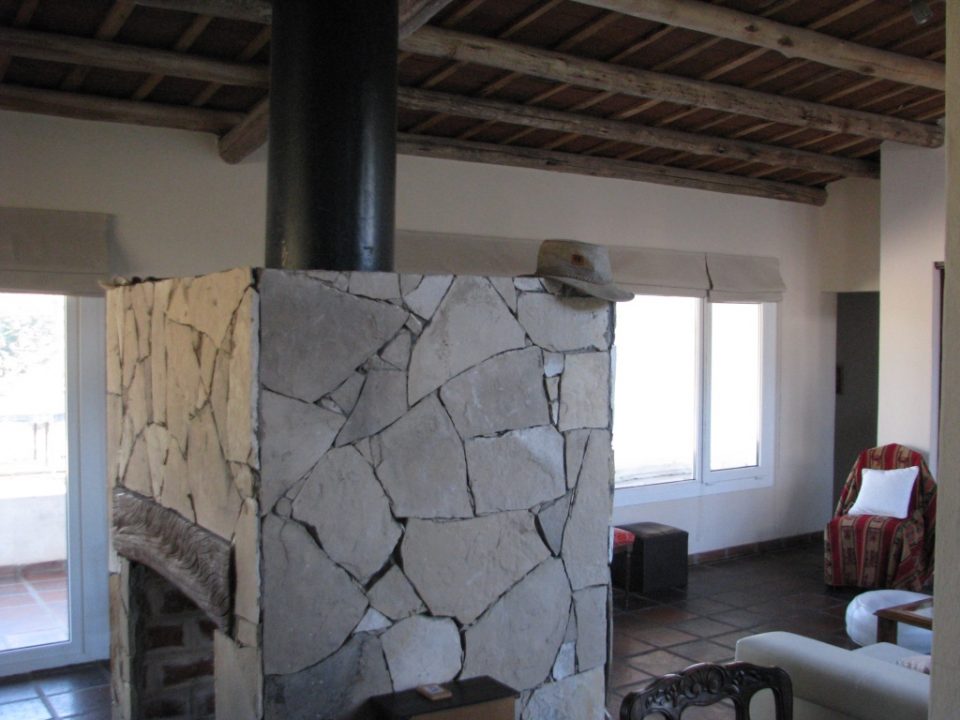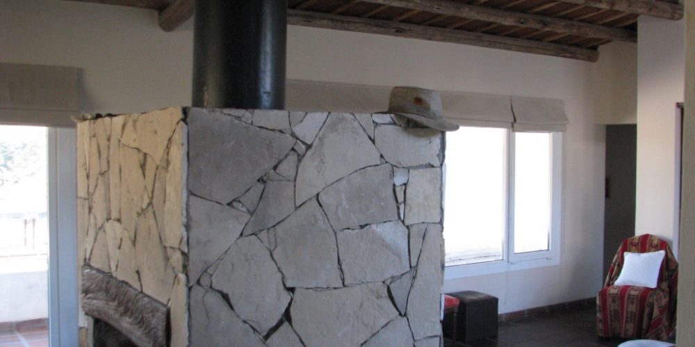 Los materiales a usar fueron muy rústicos, troncos de la zona y tejuelas de ladrillos para la cubierta, revoques texturados para muros, cerámicos colorados para pisos, piedra en chimeneas y terrazas exteriores. En las aberturas, se optó por un sistema de alta prestación tecnológica. Se usaron carpinterías de pvc blanco con doble vidriado hermético laminado.