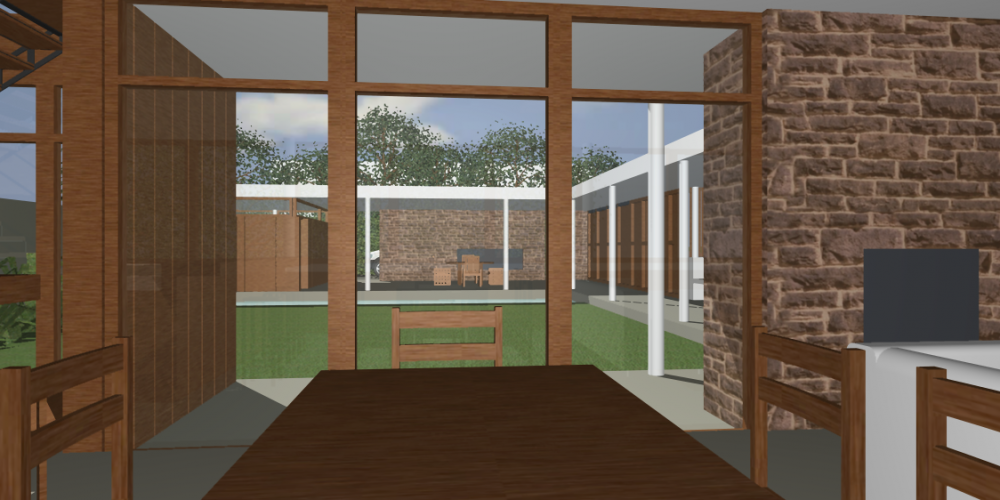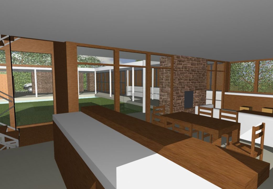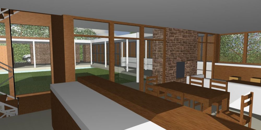 La casa la organizamos a partir de tres niveles. El social, situado en el nivel del acceso vehicular, sitio más alto del lote, formado por el acceso peatonal, el patio, la piscina, el garaje – quincho, el taller de guardado, el estar-comedor, la cocina y el lavadero. Propusimos que estar, comedor y cocina, los ambientes más significativos de la vivienda, funcionasen como un “gran balcón” para mirar el paisaje. Este debía remitirnos a algo ligero y liviano, su terminación se proyectó en revoque blanco y todo su perímetro trabajado con grandes ventanales de madera.