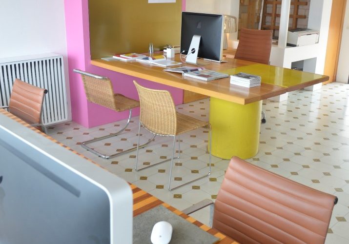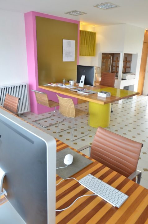 En el cuarto piso de un edificio céntrico con amplias vistas a la ciudad y sus sierras, destinado a lavadero y quincho, se remodeló su interior y parte de su exterior para alojar nuestro estudio de arquitectura. Se creó un único lugar de trabajo, rescatando al máximo lo construido para ahorrar costos y poder así aprovechar al máximo los recursos disponibles. Por ejemplo, la enorme parrilla a leña fue transformada en un hogar que cuyo fuego simbolizara el calor del momento creativo. Por este motivo era importante que la altura de la leña fuese la misma que la altura de las mesas de trabajo.